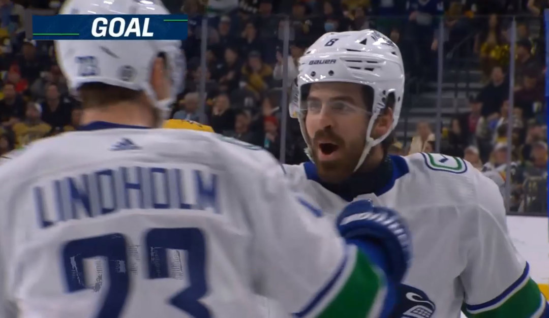 Except... Nightlies get into a bruhaha and another of their bruhs is taken off the ice. Nucks get 14 vital seconds of 5-on-3. Just as the seconds expired, Pete sets up Huggie for the 1st goal of the game - his 1st in 17 games. Has it really been that long? Ask Miki.